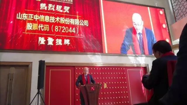 2017年9月28日,山东正中信息技术股份有限公司(证券代码:872044)新三板挂牌敲钟仪式在全国中小企业股份转让系统成功举行。齐鲁工业大学(山东省科学院)王英龙书记、刘孟德副院长、山科集团董事长董火民、山东省计算中心杨美红主任等多位领导及正中信息全体领导班子出席了本次活动,共同见证了这一重要时刻。
