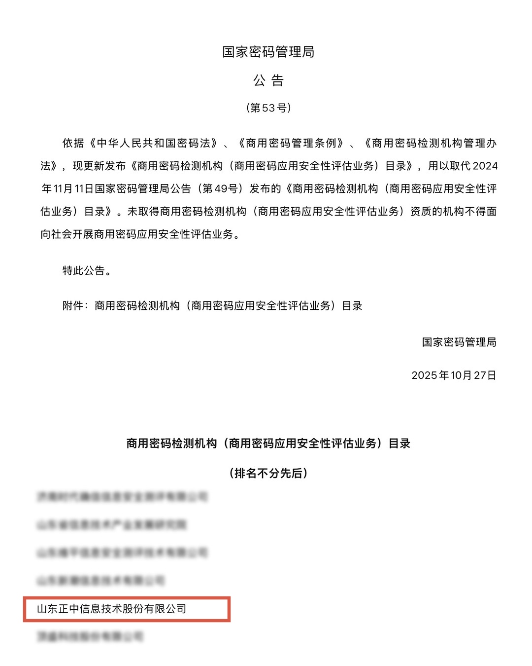 近日,国家密码管理局发布《商用密码检测机构(商用密码应用安全性评估业务)目录》。山东正中信息技术股份有限公司(以下简称“正中信息”)历经多轮严格考核和评审,成为山东首家获得商用密码检测机构(商用密码应用安全性评估业务)资质的国有企业单位!