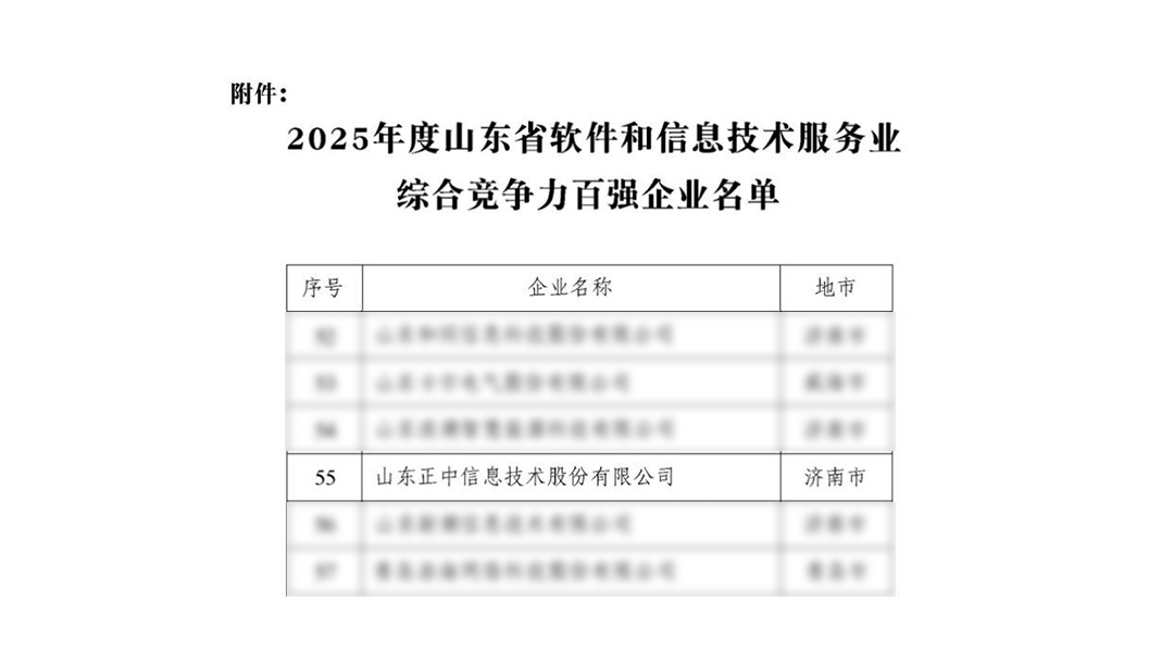 近日,山东省软件行业协会正式发布了“2025年度山东省软件和信息技术服务业综合竞争力百强企业”名单。正中信息凭借卓越的综合实力、持续的创新研发与深厚的行业积淀再度荣耀登榜。