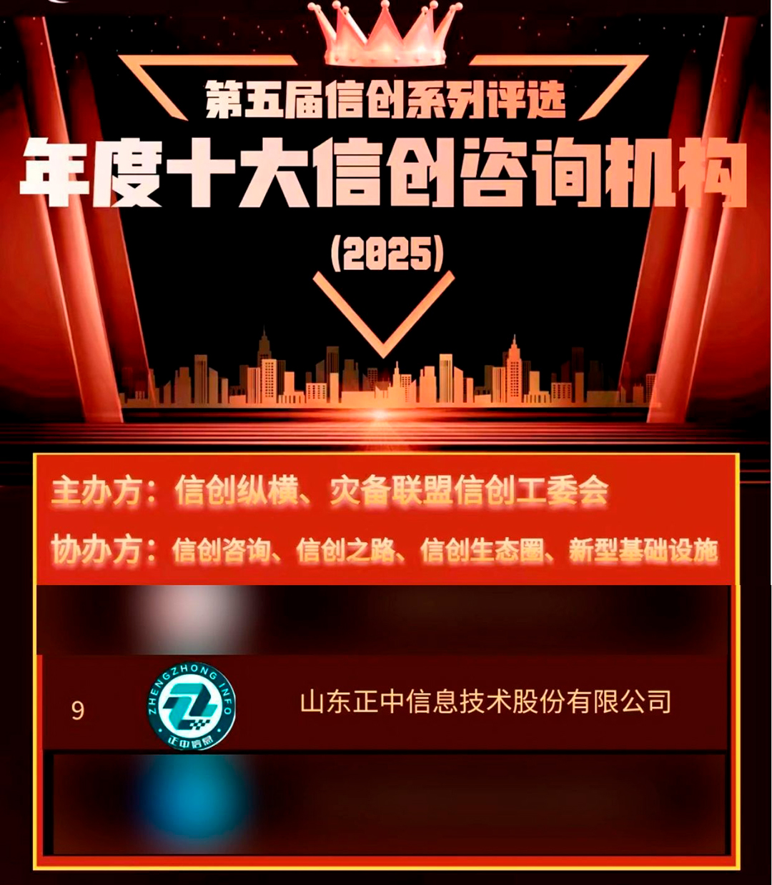近日,在信创纵横平台与灾备联盟信创工委会联合主办的“2025年度第五届信创系列评选”活动中,山东正中信息技术股份有限公司(以下简称“正中信息”)凭借深厚的行业积淀与卓越的服务表现,成功入选“2025年度十大信创咨询机构”,彰显了市场与专业层面对其信创咨询能力的高度认可。