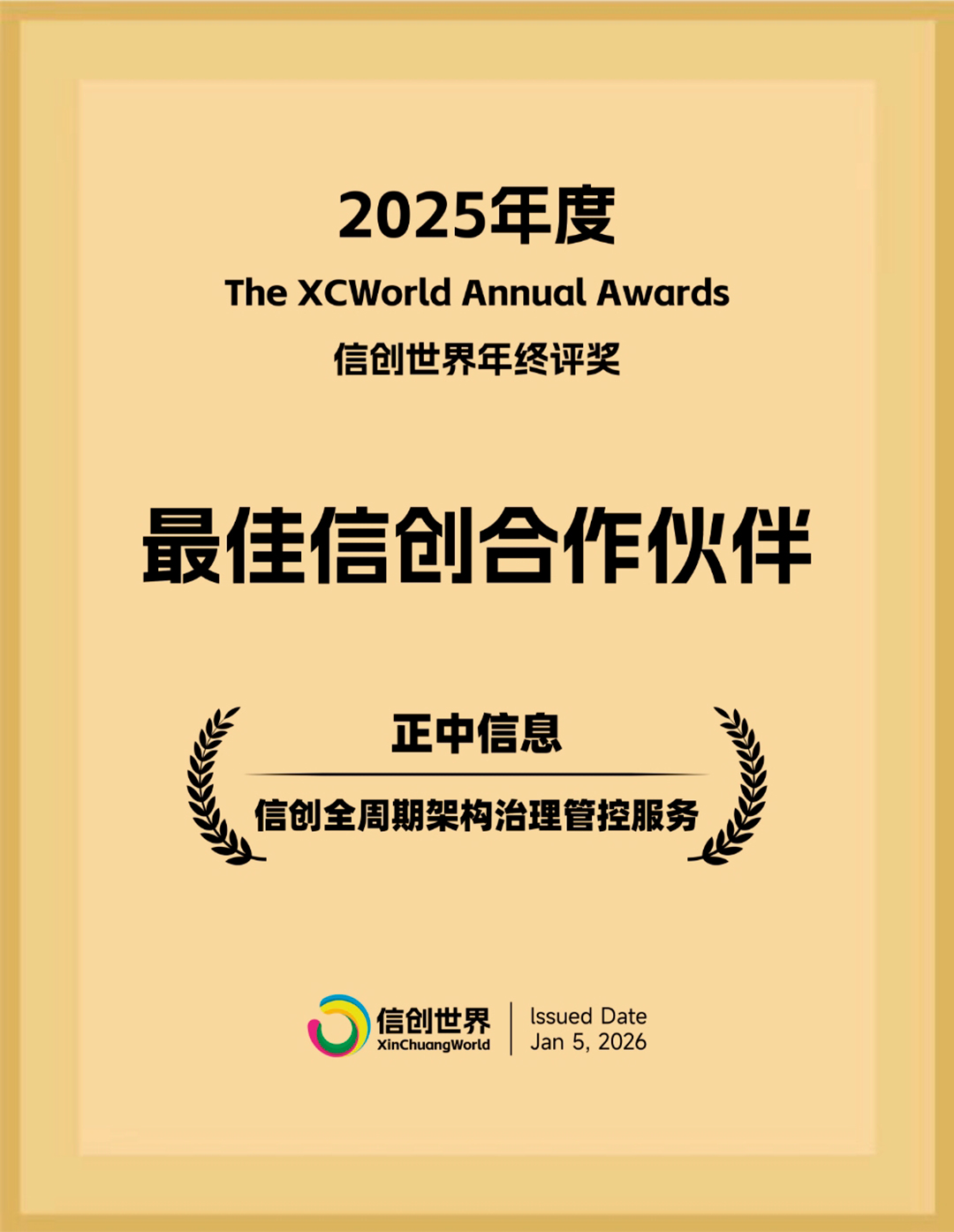 此外,在信创权威媒体“信创世界”发起的年终评奖中,正中信息参编的《信创全周期架构治理管控服务》方案,凭借创新价值与实践成效,荣获“最佳信创合作伙伴”奖项。